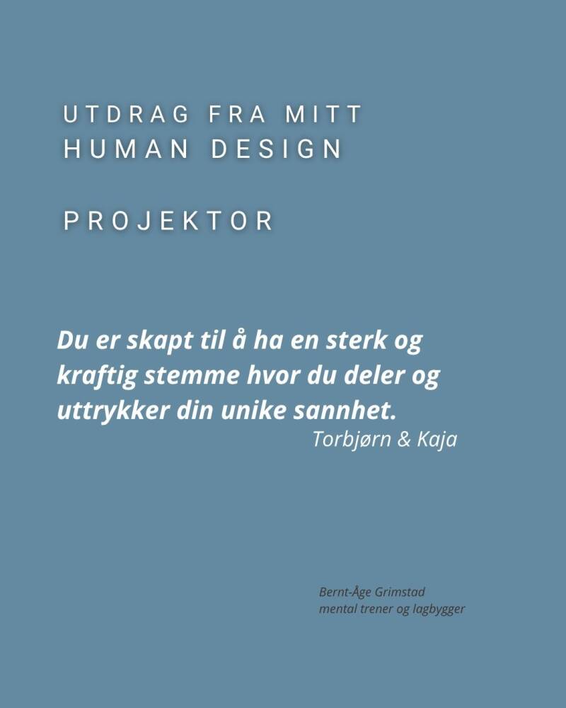 Analysen jeg mottok fra Torbjørn & Kaja blar jeg igjennom med jevne mellomrom, den gir meg økt trygghet på hvem jeg er og hvordan jeg best mulig kan leve i tråd med den ekte meg. Jeg kan derfor anbefale Human design dersom du ønsker å bli bedre kjent med deg selv og leve i tråd med den du ønsker å være.