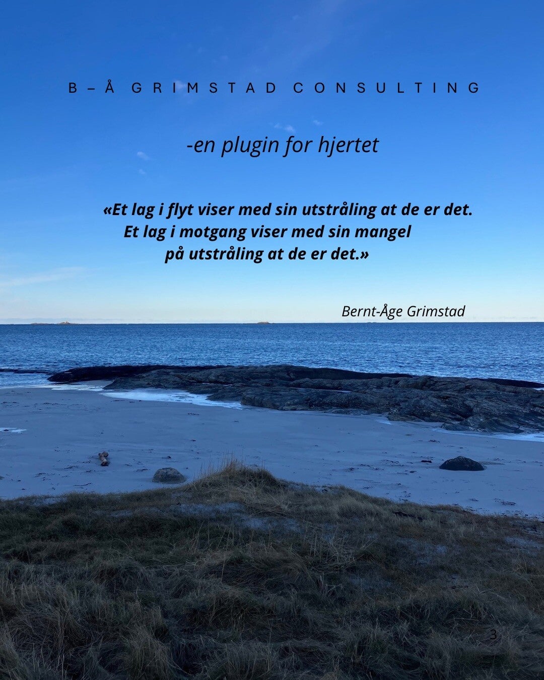Når du har det gøy på jobb, så blir det første steget på veien til å være en del av et lag i flyt. «Et lag i flyt viser med sin utstråling at de er det. Et lag i motgang viser med sin mangel på utstråling at de er det.»